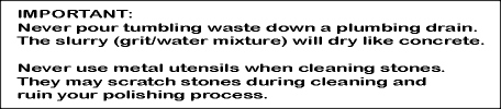 Drain and rinse the rocks using the same process as in the rough grind. Clean the rocks and barrel thoroughly. If plastic pellets were used, clean them as well and place them aside for reuse. Remember, any grit remaining on the rocks or in the barrel will contaminate the next step. Careful washing will prevent having to repeat steps later on.