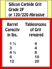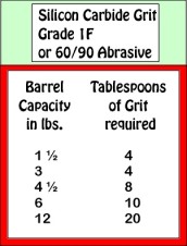Add plastic pellets to bring your load to the proper level. Use the chart at the right to determine the proper amount of grit to be used for this step. Add water, as in all steps, to just below the surface of the top of the stones.