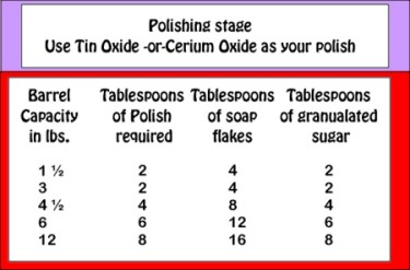 Place your good stones in the barrel. Fill your barrel to the appropriate level with plastic tumbling pellets (if necessary). This stage, you will be using a total of four (4) ingredients in order to achieve a high polish on your rocks. I use Tin Oxide, Snow White Soap Flakes, Granulated Sugar, and Water. Use the following table to determine the quantities needed for each ingredient for your particular sized rock tumbler: